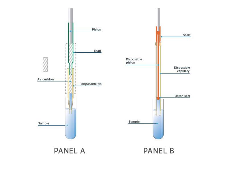 Ciecz ma bezpośredni kontakt z tłokiem, ale nigdy nie styka się z pipetą bezpośrednio, co eliminuje wpływ lepkości, gęstości i czynników środowiskowych na dokładność pipetowania.
