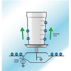 Pod uziemioną szalką wbudowana jest elektroda koncentryczna i przykładany jest do niej sygnał prądu zmiennego. Dodatnia półfala sygnału napięcia generuje ładunki dodatnie na elektrodzie (a). Ujemna półfala sygnału napięcia generuje ujemne nośniki ładunku na elektrodzie ujemnej (b). Różnica wyników pomiaru uzyskanych w obu tych sytuacjach (a i b) wynika z działania sił elektrostatycznych (FE ). Jeśli próbka lub naczynko nie są naładowane elektrostatycznie, wynosić ona będzie zero. Na podstawie tej metody czujnik może określić rzeczywistą masę próbki.