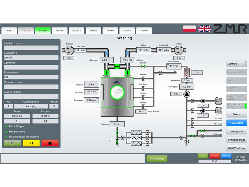 Wizualizacja procesu mycia maszyny po procesie powlekania.