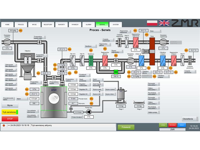 Tryb serwisowy powlekarki D600/750Ex z podglądem i regulacją każdego elementu.