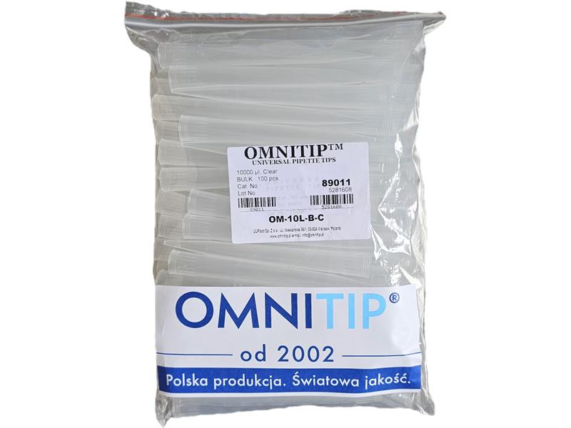 Końcówki OMNITIP do pipet, poj. 500-10000 µl, długość 154,4 mm, bezbarwne, w opakowaniach zbiorczych (workach). Jedno opakowanie zawiera 100 sztuk. Odpowiednio zaprojektowany kształt kołnierza końcówki umożliwia współpracę końcówek OMNITIP z pipetami automatycznymi różnych marek. Elastyczne, cienkie ścianki kołnierza zapewniają doskonałe uszczelnianie się końcówek na trzonie pipety, a tym samym gwarantują prawidłowe pobieranie cieczy.
