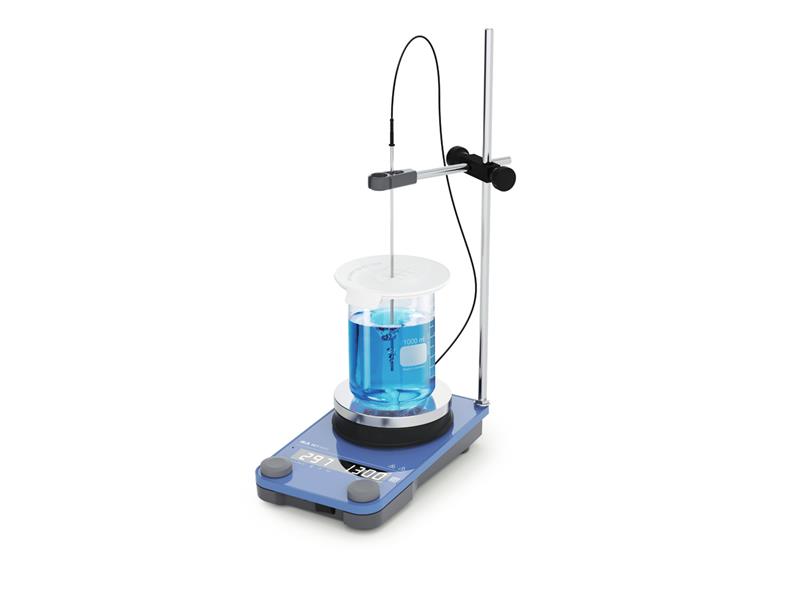 To kompletne rozwiązanie obejmuje statyw wraz z wysięgnikiem i zaciskiem głowicy. Zapewniają one prawidłowe i bezpieczne pozycjonowanie czujnika temperatury PT 1000, który również znajduje się w zestawie, ponieważ powinien on zawsze znajdować się poza wirem utworzonym podczas mieszania i powinien być zanurzony w medium na głębokość co najmniej 20 mm. Dzięki statywowi pozycja czujnika temperatury jest precyzyjnie dostosowana do naczynia reakcyjnego i poziomu w ustawieniu pionowym i poziomym.